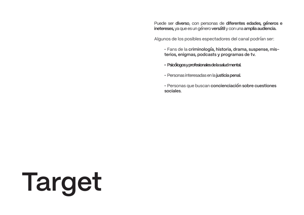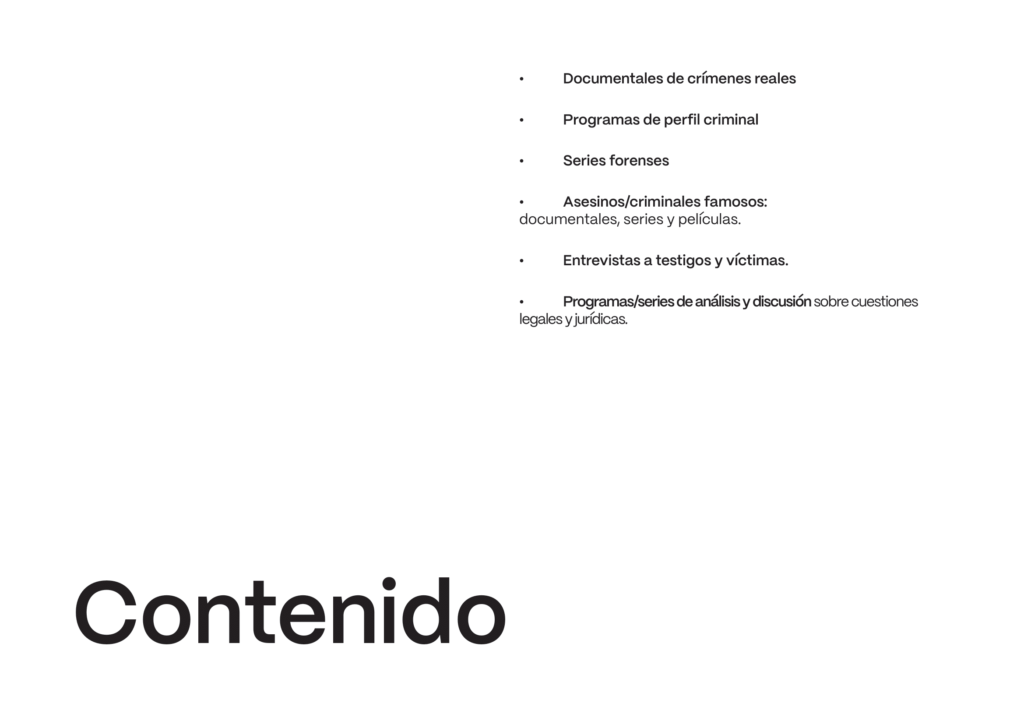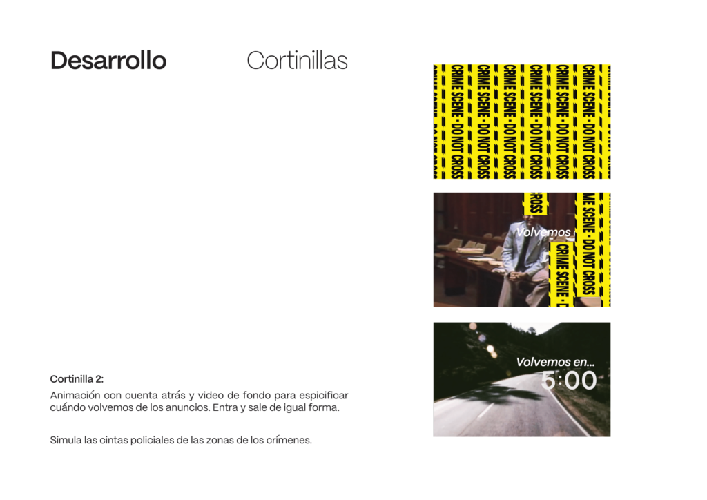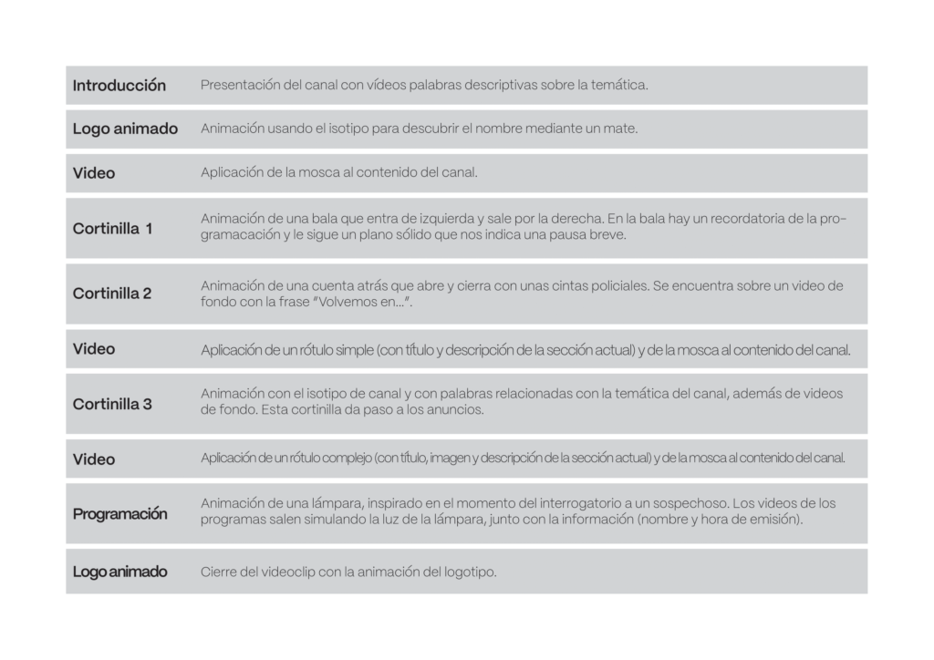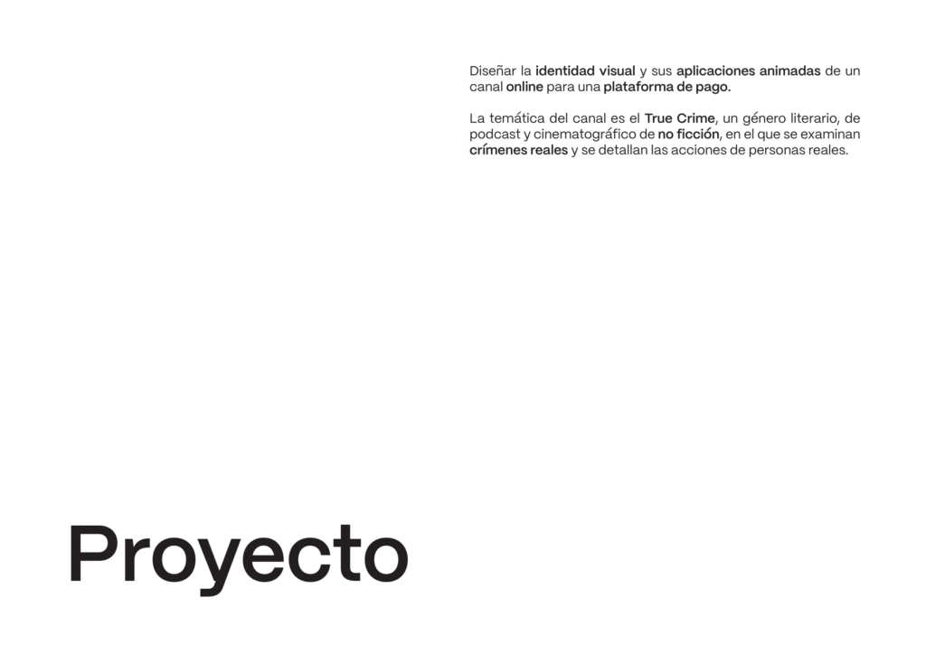 En este proyecto se nos encarga diseñar la identidad visual y sus aplicaciones animadas de un canal de televisión ficticio con la temática que quisiéramos, siendo el mío de «true crime».